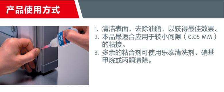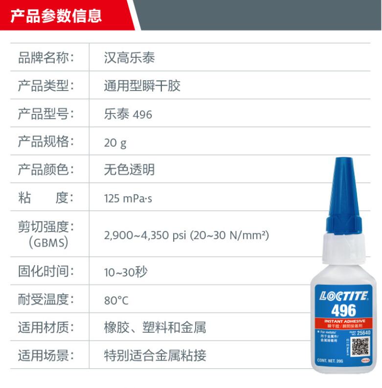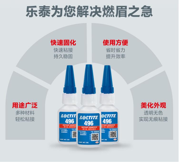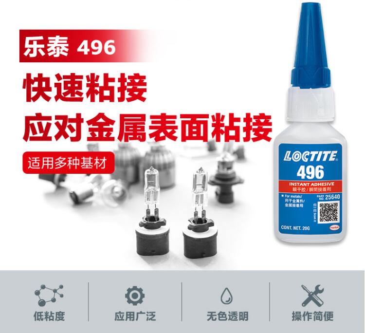 LOCTITE/乐泰 496 低粘度金属粘接型瞬干胶适用于橡胶、塑料和金属,特别适合金属粘接。
