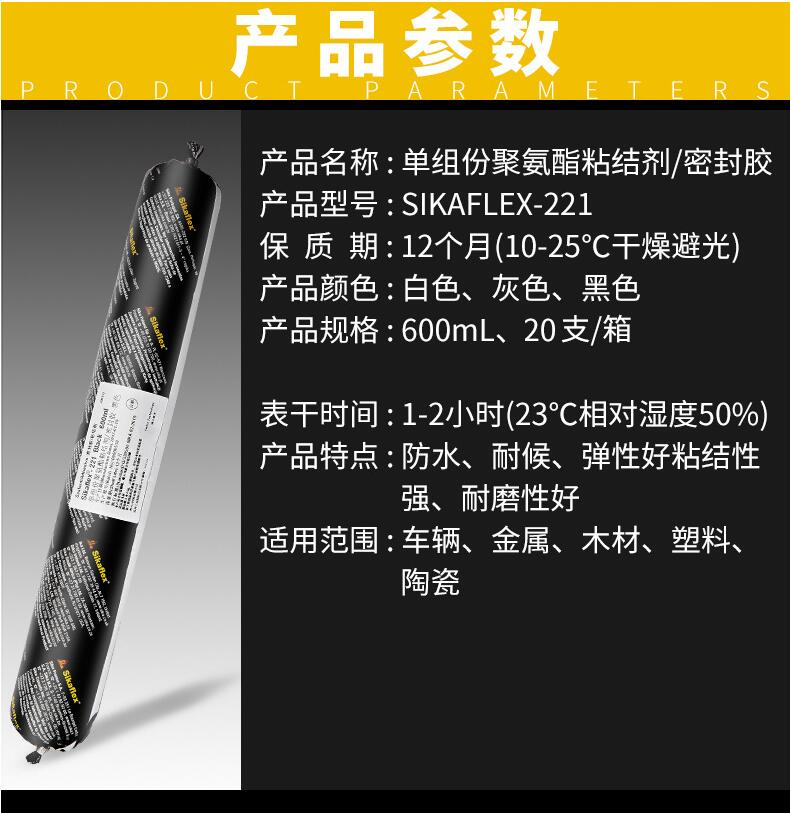 SIKA/西卡 221颜色为黑色通用型聚氨酯密封胶,防水、防候、弹性好粘结性强、耐磨性好。适用车辆、金属、木材、塑料、陶瓷的材料。