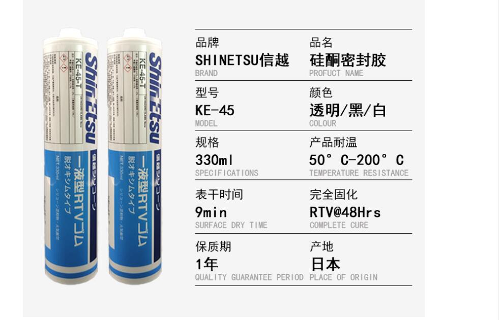 KE-45-T是一种单组分、中性、快速固化的通用型密封粘接硅橡胶,它适用于一般电气结构密封和绝缘。固化时无明显不良气味,对大多数金属及电器元件没有腐蚀。该产品对于大多数材质表面有很好的粘接力及良好的延展性,尤其对于碱金属、石灰、白水泥等材质的相对于其他类型的硅橡胶而言,粘接力具有优势。它具有很好的耐候性,通过了户外淋雨、曝晒,长期使用性能稳定(寿命达30年)。并具有一定的耐酸、碱、盐、润滑油腐蚀的能力。